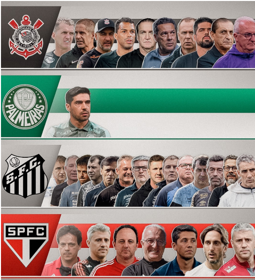 “O que me move é a paixão por competir e o amor pelo jogo”, já disse Abel. Mas tenho que dizer que não basta apenas isso: a resiliência do Abel é totalmente fora do normal e para tirar a prova disso basta ver essa imagem de quantos treinadores os 4 grandes clubes de São Paulo tiveram nos últimos 5 anos: