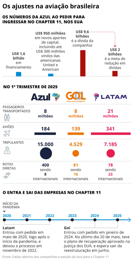 Mas apesar desses bons números, a crise do setor aéreo já vitimou diversas empresas brasileiras ao longo dos tempos. Da falência da icônica Varig – decretada oficialmente em 2010 – aos pedidos de recuperação judicial de Gol, Latam e Azul nos Estados Unidos, conforme mostrou esse gráfico do jornal Folha de S. Paulo.