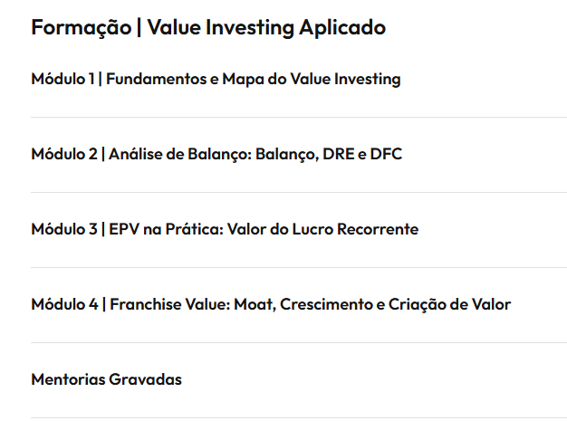 Hoje, eu tenho muito orgulho de anunciar que o Math transformou todo esse aprendizado absorvido em um curso prático de Formação de Value Investing.
