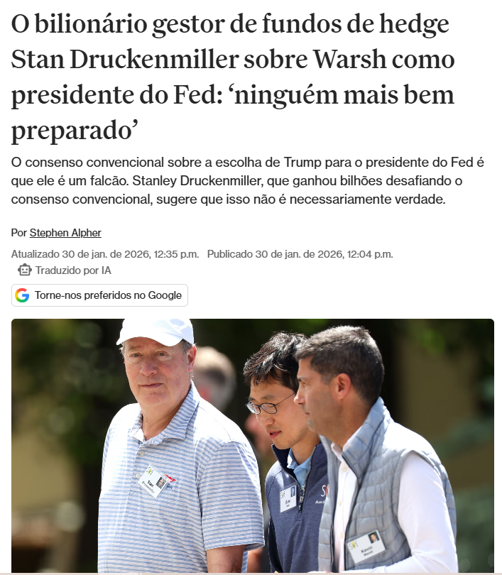 Kevin Warsh foi confirmado como próximo presidente do Fed. Por ser uma figura notoriamente mais “hawkish” que a maioria dos outros candidatos ao páreo (o que significa que ele é mais duro em relação a cortar juros) e pela sua indicação ter sido por fatores predominantemente técnicos, a última sexta-feira foi de reversão de tudo que aconteceu em janeiro – ou seja, dólar subiu muito afora, prata despencou 25%, ouro caiu 10% e outros ativos de risco foram junto. Correção de um movimento exagerado que vimos em janeiro ou o mercado deu um giro de 180 graus? Fico com a primeira opção.