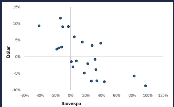 A relação entre a trajetória do Ibovespa e da nossa taxa de câmbio não tem uma regra claramente definida: existem anos que o dólar subiu e o Ibovespa também, que o dólar subiu mas o Ibovespa caiu e que o dólar caiu e o Ibovespa subiu. Mas nunca, NUNCA, o Ibovespa caiu em um ano que o dólar caiu.