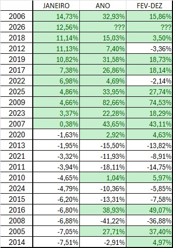 Em todos os anos que o Ibovespa subiu em janeiro, ele fechou o ano em alta. Nas últimas 10 vezes que isso aconteceu, a performance média do Ibovespa no ano foi de 30%, tendo a máxima de 82,7% e a mínima de 4,7%.