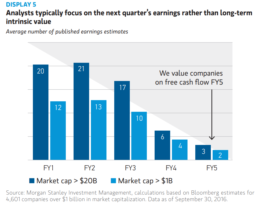 Por fim, o estudo traz uma estatística que empiricamente eu percebo nas minhas interações: a esmagadora maioria dos analistas modela apenas dois ou três anos à frente. Isso significa que quase ninguém está tentando estimar o que realmente determina o valor intrínseco de um negócio – seus lucros, fluxos de caixa e vantagens competitivas daqui a cinco ou dez anos.