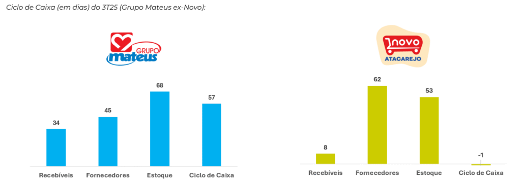 Mas talvez o ponto mais poderoso esteja no capital de giro. O Novo opera com um ciclo de caixa negativo de 1 dia. Em termos simples, isso significa que a empresa recebe do cliente antes de pagar o fornecedor – ou seja, são os fornecedores que financiam a operação. Já o Grupo Mateus, hoje, possui um ciclo de caixa de aproximadamente 57 dias, o que implica necessidade de capital próprio para sustentar o crescimento.
