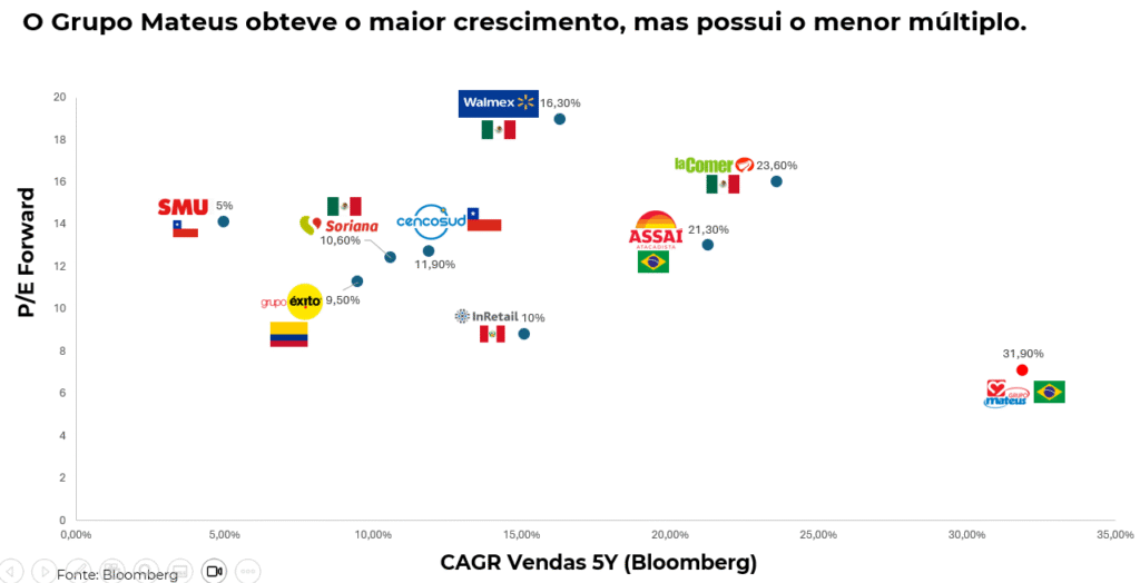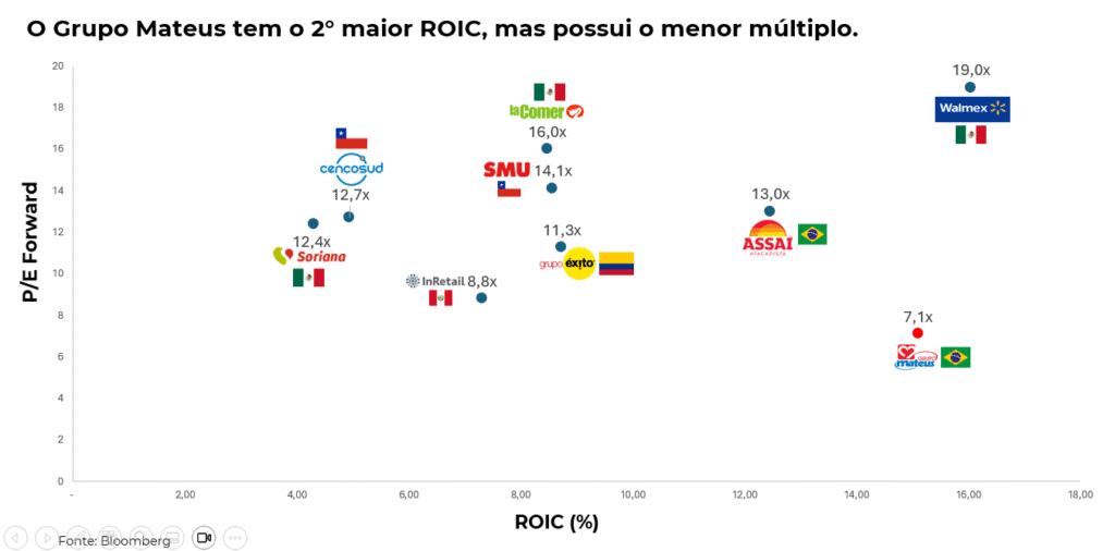 O Grupo Mateus apresenta o 2º maior ROIC do setor entre os players latino-americanos, ficando atrás apenas do Walmex, e foi a empresa com o maior crescimento de receita nos últimos cinco anos, segundo dados da Bloomberg. Ainda assim, negocia hoje ao menor múltiplo entre todos os varejistas alimentares da região.