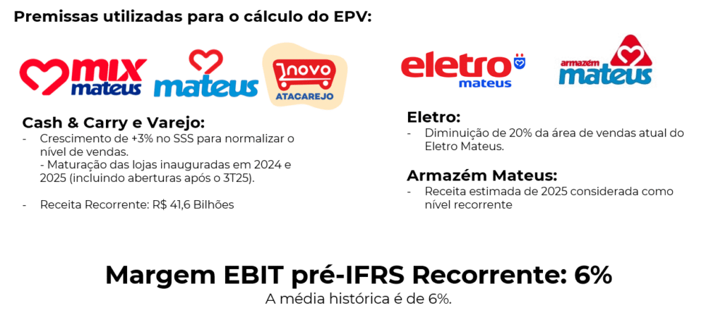 Quando calculamos o Earnings Power Value (EPV) do Grupo Mateus — isto é, o valor que a companhia deveria ter sem assumir qualquer crescimento adicional, considerando apenas o lucro operacional recorrente (NOPAT) atual e os ganhos naturais da maturação das lojas já existentes – chegamos a um valor de aproximadamente R$ 10,8 bilhões.