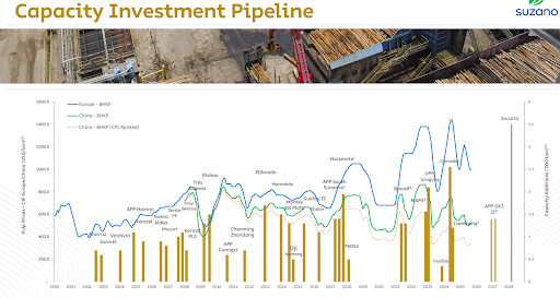 É esse nicho de mercado que a Suzano domina. Ela detém 35% de participação global no mercado de celulose de fibra curta (BHKP) e acaba de expandir ainda mais sua liderança com o Projeto Cerrado, que adicionou 2,5 milhões de toneladas por ano, levando sua capacidade total a 13,4 milhões.