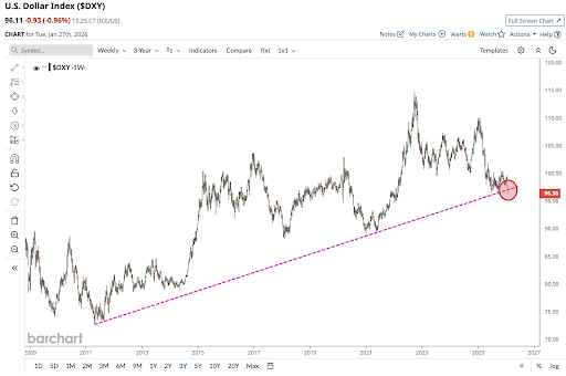 O primeiro ponto é que a tendência de queda do dólar contra uma cesta de moedas (DXY) continua e acaba de ‘romper’ para baixo o suporte de 14 anos.