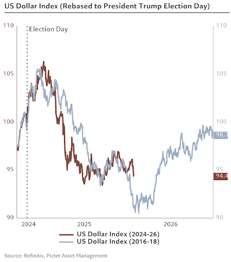 E aí vem o segundo ponto: esse pano de fundo tem provocado um rebalanceamento global de portfólios que já vinha desde o ano passado. Depois de muitos anos com todo mundo “comprado em Estados Unidos”, começa um movimento mais estrutural de diversificação — e, consequentemente, um fluxo contra o dólar.