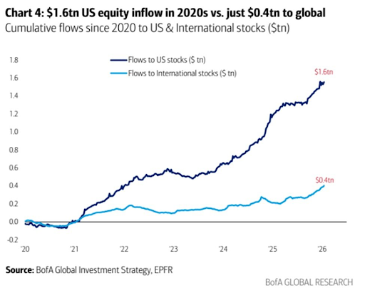 Eu ainda acho cedo falar em “colapso do dólar”. Apesar de todo o esforço americano. O que eu vejo é uma normalização depois de um ciclo que foi excepcionalmente favorável: dólar forte, bolsas americanas liderando com folga, e o mundo inteiro super concentrado nos EUA. Vale lembrar que as ações americanas registraram um fluxo líquido recorde de +US$ 1,6 trilhão desde 2020 – isso é 4x maior que os mais de US$ 400 bilhões que entraram em ações internacionais.