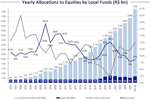E o Brasil? O Brasil surfou essa onda em 2025. Subimos 34% em reais e 51% em dólares.