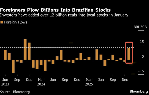 E o que está acontecendo agora em 2026 chama muito a minha atenção pelo tamanho do fluxo vindo para o Brasil – a ponto de o mercado já projetar que janeiro pode receber os mesmos US$ 5 bilhões que recebemos no ano de 2025 inteiro.