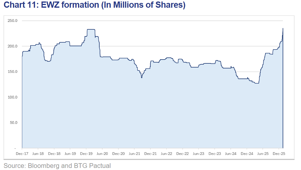 Um detalhe importante: boa parte do fluxo que está vindo para o Brasil não está chegando “na unha”, ação por ação – está vindo via índice/ETF. E isso aparece claramente no EWZ (o principal ETF de Brasil lá fora). A criação de novas cotas acelerou: +78% ano contra ano em 2026, depois de +53% em 2025. Resultado: o EWZ hoje tem o maior número de cotas em circulação da história, acima até de 2019 (pré-pandemia).