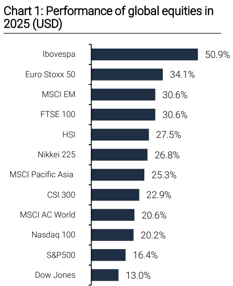 E vale lembrar que, em 2025, moedas de países emergentes se valorizaram versus dólar e as bolsas subiram muito forte, com performance superior ao S&P 500 e Nasdaq.
