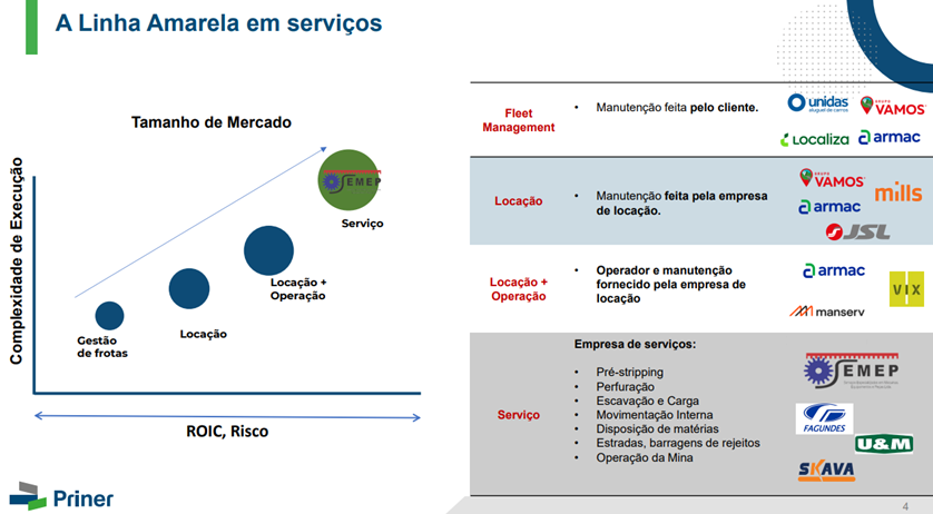 Dentro dos equipamentos a serem operados pela Semep está o segmento de veículos off-road, que possui mercado endereçável grande, barreiras de entrada relevantes e margens mais elevadas do que as operações minerárias mais “comoditizadas”. Hoje, no Brasil, há poucos players atuando de forma escalável – com destaque para a U&M – e existe um detalhe importante: esse tipo de frota costuma ser produzida sob demanda pelas montadoras, o que exige uma estrutura de capital robusta e disciplina de alocação para quem deseja entrar (ou expandir) nesse mercado.