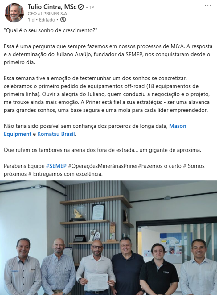Para a nossa surpresa, o Tulio anunciou ontem em seu Linkedin a compra de 18 equipamentos de primeira linha desse segmento.
