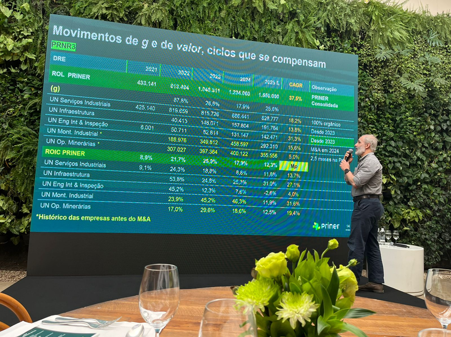 As outras verticais da Priner também mostraram resiliência em 2025. A unidade de Serviços Industriais cresceu cerca de 24% ano contra ano; a de Engenharia de Integridade e Inspeção avançou 14%, mesmo com clientes relevantes reduzindo operações; e a vertical de Infraestrutura cresceu 8,6%, já sobre uma base forte em 2024. Excluindo as unidades de Montagem e Operações Minerárias – que ainda estão em fase mais recente de maturação -, o crescimento orgânico da receita da Priner foi de 22,5% em 2025. Mas em uma apresentação realizada ao final do ano passado, disponível no YouTube, Tulio Cintra destacou que, em 2025, o ROIC de todas as unidades de negócio – com exceção de Infraestrutura – ficou abaixo da média histórica.
