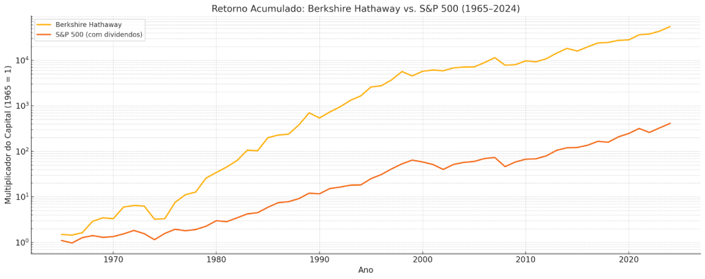 O livro me impactou tanto que a partir dele mergulhei nos investidores que seguiram essa filosofia. E todos aqueles que a seguiram com rigor bateram o mercado de forma consistente. O exemplo máximo é a Berkshire Hathaway. Em seis décadas, Buffett entregou 19,9% ao ano — multiplicando o valor da empresa em 55 mil vezes, contra 390 vezes do S&P 500.